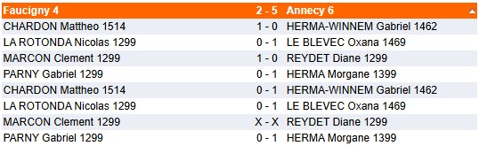 Dans la même catégorie Ronde 4 Ronde 4 face à Annecy 5 Les résultats : Les classements après la ronde 4 : Critérium Ronde 2 Notre équipe 4 s'est déplacée à Gex pour la 2ème ronde du critérium Nicolas Chardon : victoires aller et retour. "Amusé d'avoir maté les deux fois du pion" Matthéo... Critérium Ronde 1 Cette nouvelle compétition vient compléter l’offre saturée des interclubs du bas de la pyramide. La formule est sympa : deux parties aller retour avec changement des couleurs à la cadence de 1h +... Critérium