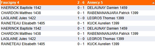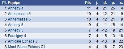 Dans la même catégorie Ronde 3 Ronde 3 face à Annecy 6 Les résultats : Les classements après la ronde 3 : Critérium Ronde 2 Notre équipe 4 s'est déplacée à Gex pour la 2ème ronde du critérium Nicolas Chardon : victoires aller et retour. "Amusé d'avoir maté les deux fois du pion" Matthéo... Critérium Ronde 1 Cette nouvelle compétition vient compléter l’offre saturée des interclubs du bas de la pyramide. La formule est sympa : deux parties aller retour avec changement des couleurs à la cadence de 1h +... Critérium