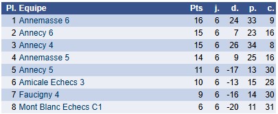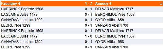 Dans la même catégorie Ronde 4 Ronde 4 face à Annecy 5 Les résultats : Les classements après la ronde 4 : Critérium Ronde 3 Ronde 3 face à Annecy 6 Les résultats : Les classements après la ronde 3 : Critérium Ronde 2 Notre équipe 4 s'est déplacée à Gex pour la 2ème ronde du critérium Nicolas Chardon : victoires aller et retour. "Amusé d'avoir maté les deux fois du pion" Matthéo... Critérium