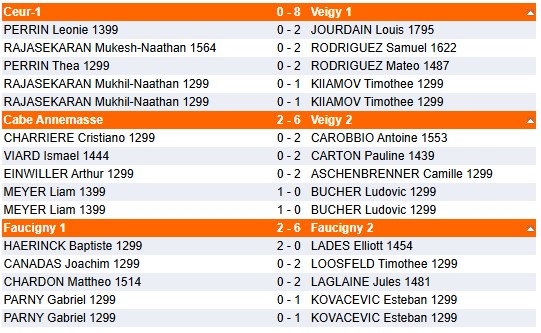 La première ronde confrontait nos deux équipes entre elles. Et les résultats ont déjoué nos pronostics car c'est l'équipe 2 qui a pris le dessus sur l'équipe 1. Nous félicitons l'équipe 2, ce qui a permis aux joueurs de faire le plein de confiance pour la suite.